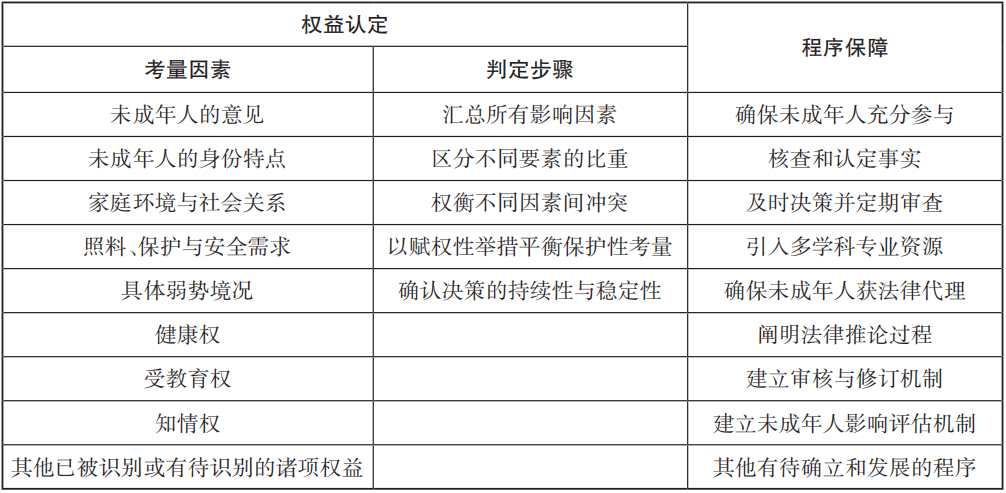 在人類有限理性的限定下,兒童最大利益是以實(shí)現(xiàn)兒童權(quán)利為指引、嚴(yán)格遵守評(píng)判依據(jù)和決策程序?yàn)榍疤釀澏ǖ淖畲罄妫哂幸蛉硕惡蛣?dòng)態(tài)發(fā)展的特性。同理,最有利于未成年人原則的適用也必須通過明確的標(biāo)準(zhǔn)和規(guī)范的程序確保其穩(wěn)定性和可行性,否則就可能被濫用或被武斷解釋從而損害未成年人的基本權(quán)利。正因如此,當(dāng)前歐洲人權(quán)法院對(duì)兒童最大利益原則適用的審查越來越多地采用程序性審查模式。借鑒童權(quán)委對(duì)判定兒童最大利益的闡述和歐洲人權(quán)法院在相關(guān)案例中的嘗試和探索,最有利于未成年人原則的實(shí)施可遵循如表4所示的標(biāo)準(zhǔn)與程序。