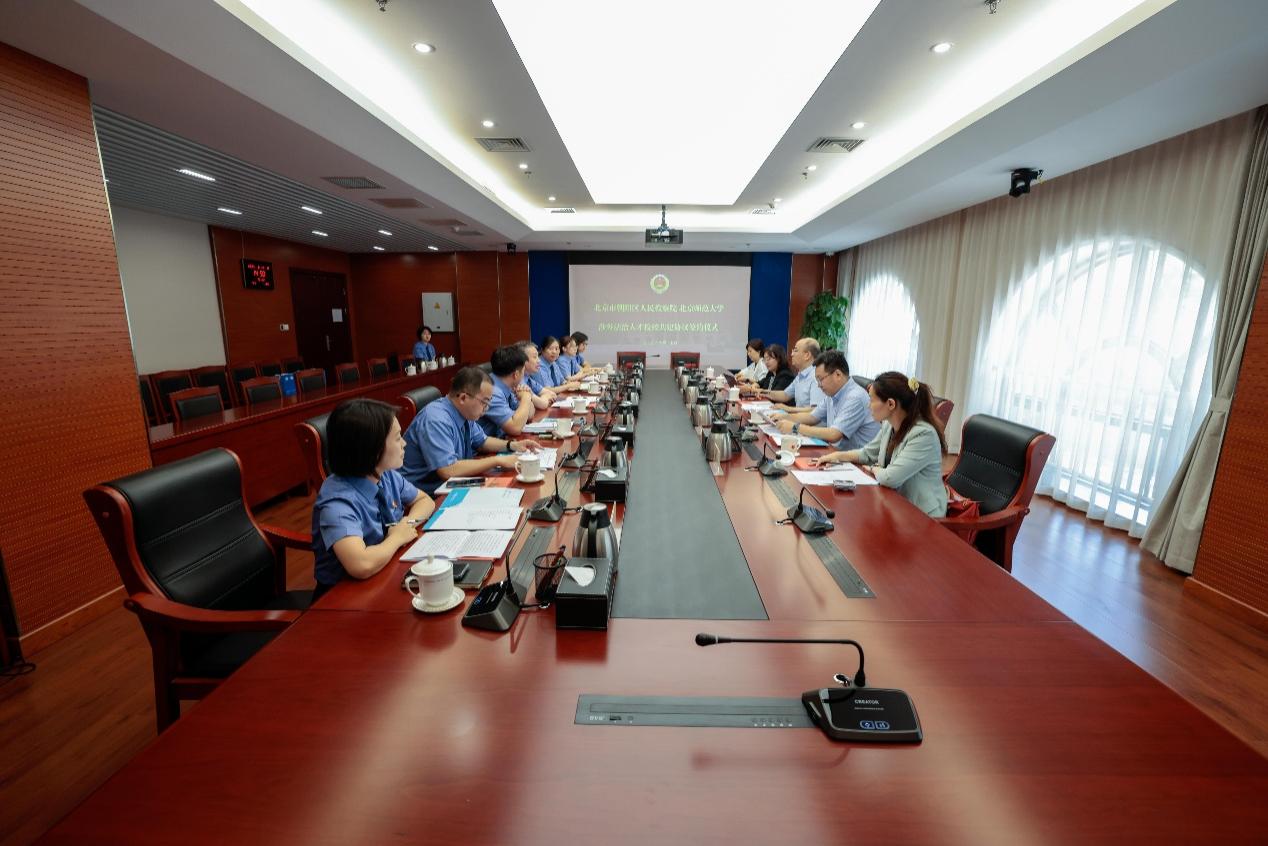 會上,馬天博檢察長詳細(xì)介紹了朝陽區(qū)檢察院的亮點(diǎn)工作、隊(duì)伍建設(shè)和干警培養(yǎng)等相關(guān)情況;梁迎修院長對法學(xué)院的發(fā)展情況、教學(xué)情況及學(xué)科建設(shè)情況等方面進(jìn)行介紹;胡靜副檢察長與梁迎修院長作為雙方代表簽署了涉外法治人才檢校共建協(xié)議。"朝檢·涉外博匯學(xué)堂"開班儀式上,朝陽檢察院政治部宣教組組長、涉外檢察辦公室主任張力介紹"涉外博匯學(xué)堂"相關(guān)情況,帶教檢察官莊小茜作代表發(fā)言。