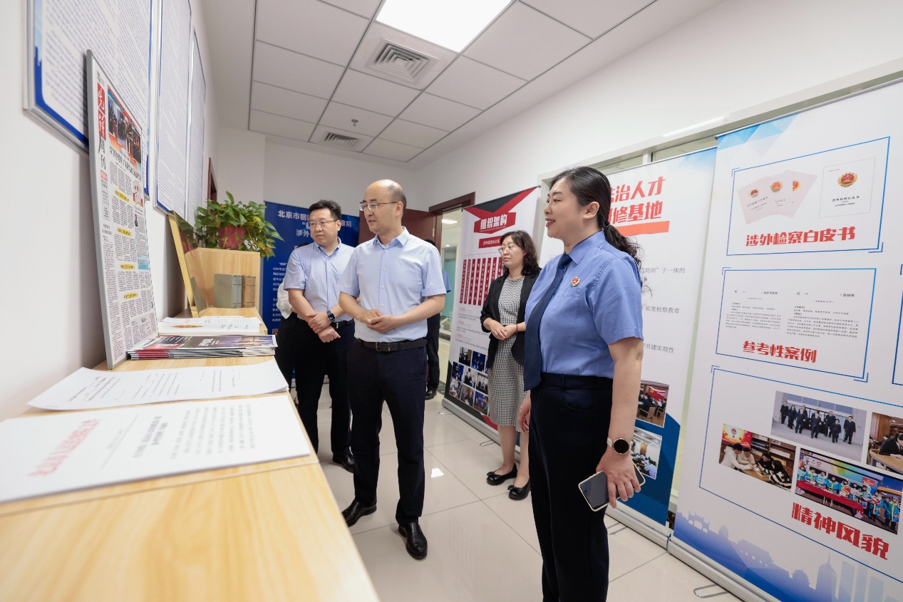 會前,梁迎修院長一行先后參觀了朝陽檢察院涉外案件遠(yuǎn)程提訊室、涉外案件聽證室、涉外案件遠(yuǎn)程工作室、律師接待中心、涉外檢察辦公室、涉外黨建活動室等辦公場所。