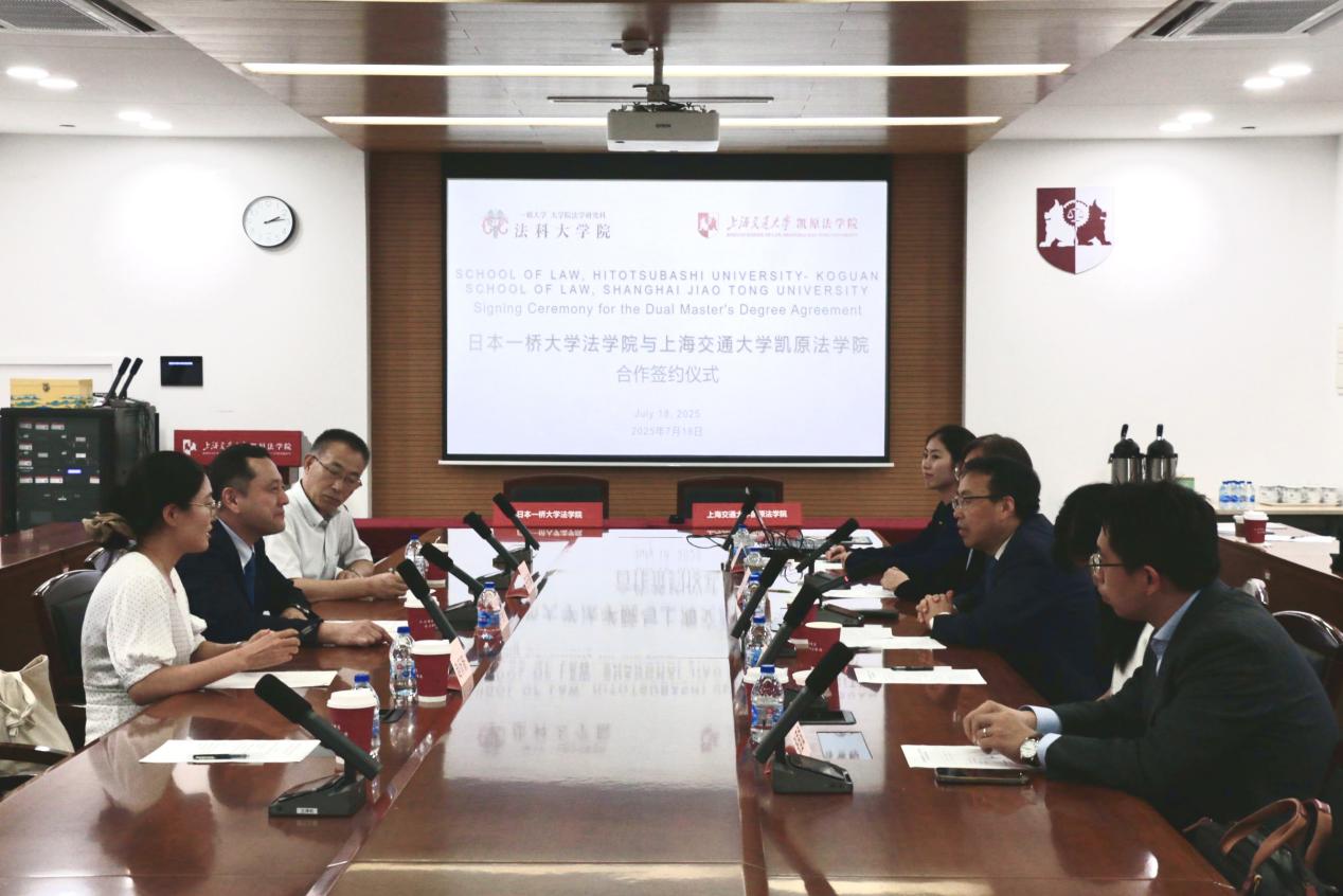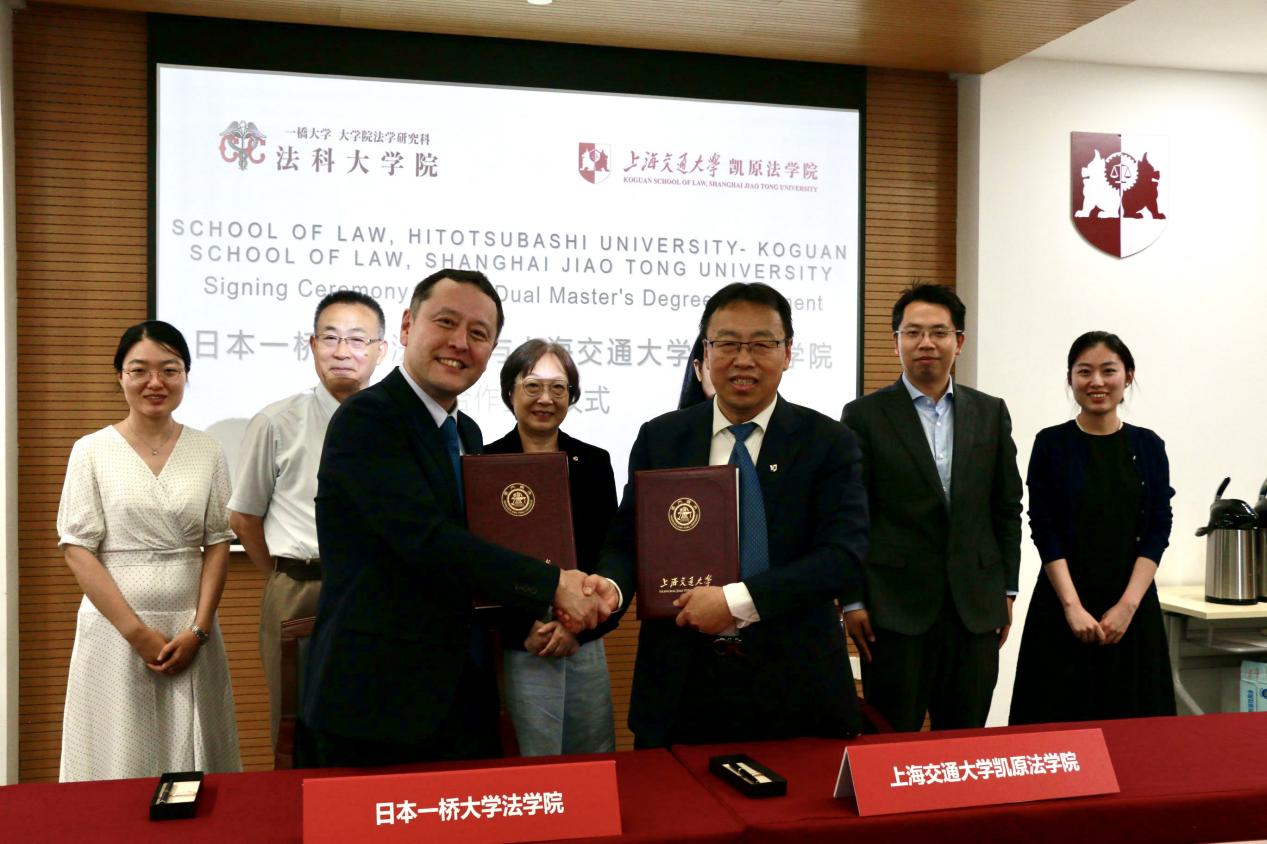 7月18日,上海交通大學(xué)凱原法學(xué)院院長彭誠信教授與一橋大學(xué)法學(xué)院院長竹下啓介教授分別代表兩院在凱原法學(xué)院簽署《上海交通大學(xué)凱原法學(xué)院與一橋大學(xué)法學(xué)院雙碩士學(xué)位項(xiàng)目協(xié)議》。日本一橋大學(xué)法學(xué)院王云海教授、上海交通大學(xué)凱原法學(xué)院副院長郭延軍教授、于改之教授、院長助理張國斌副教授、國際化辦公室副主任殷瀾等參加簽約儀式。