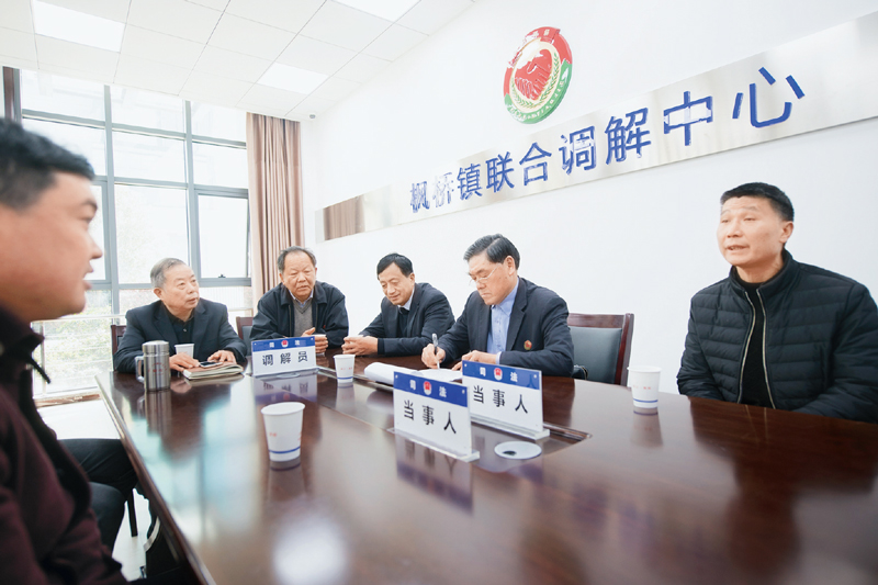 “楓橋經(jīng)驗(yàn)”是創(chuàng)新群眾工作方法,善于運(yùn)用法治思維和法治方式解決涉及群眾切身利益矛盾和問(wèn)題的典范。圖為2019年4月1日,在楓橋鎮(zhèn)聯(lián)合調(diào)解中心,工作人員在調(diào)解一起合資糾紛。 新華社記者 翁忻旸/攝